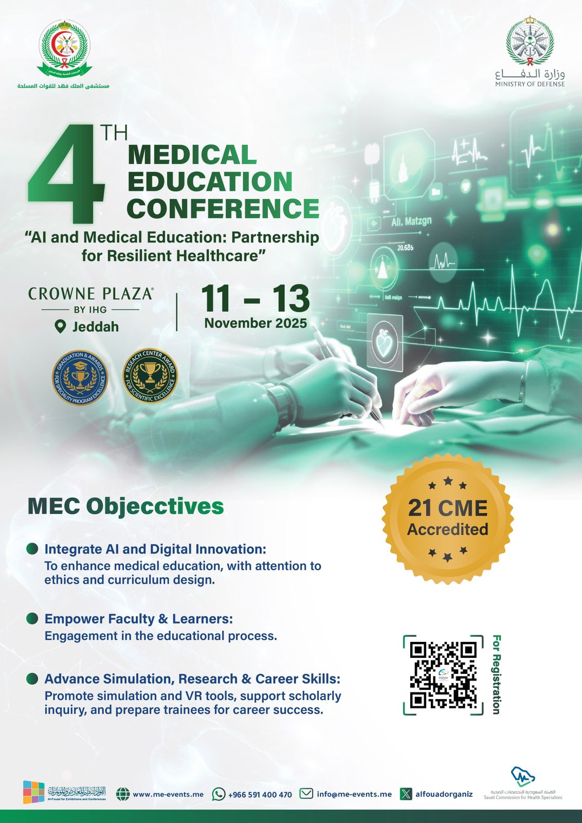 يسعدنا أن نرحب بكم في المؤتمر الرابع للتعليم الطبي، الذي يستضيفه مستشفى الملك للقوات المسلحة بجدة، ويهدف إلى الارتقاء بجودة التعليم الطبي، ودعم مسارات الابتكار، والتمكين، والاستدامة.